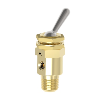 Two way miniature Toggle valve, detented, with 10-32 UNF ports. TAC Toggle valves feature an attractive lever above a 15/32-32 threaded collar. Feature permits easy panel mounting. Toggle design prevents valve overstroke. Compact. Rugged.