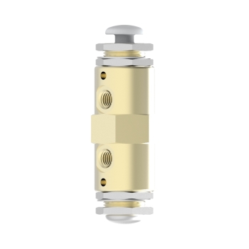 Four way miniature double Push Button valve, detented with 10-32 UNF ports. All TAC Push Button valves feature work hardened SST button plungers above 15/32-32 threaded collars. Feature permits panel mounting or acceptance of a variety of TAC Mechanical Operators (sold separately - see Related Products below). Button is rounded for minor "off center" hits and bottoms out on collar to prevent valve overstroke. Compact. Rugged.