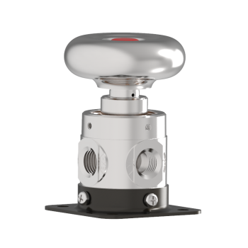 250HO Series 1/4 pipe Hold-On, Palmbutton Valve is pneumatically detented and features the classic Humphrey diaphragm poppet principle. The unbalanced, internally piloted design assures bubble-tight sealing at rest and actuated. Large palm operator reduces operator fatigue to open valve. Depress small red button to close. Valve closes when internal pressure drops below ~12psi. Mount inline or with base.