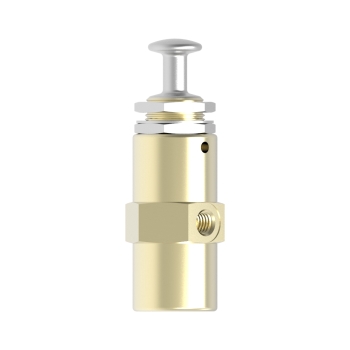 Four way miniature Push-Pull Button valve, detented, with 10-32 UNF ports. All TAC pushbutton valves feature an attractive, work hardened SST button above a 15/32-32 threaded collar. Feature permits panel mounting and bottoms out on collar to prevent valve overstroke. Compact. Rugged.