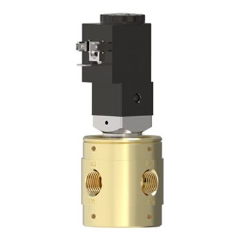 The brass body B250AE1 Series 2 or 3-Port Diaphragm-Poppet Solenoid Valve shifts crisply and seals tight with each cycle. Powered with high shifting force of external compressed air pilot signals, this valve is a smart choice for control of critical inert gases and liquids, or low pressure clean dry air applications. The unique simple diaphragm-poppet construction is reliable, lasts longer. Exceptional flow capacity with 1/4 inch orifice, 1/4 ports. Suitable for control of 0-125psi pneumatic or 0-60psi liquid. Select normally closed or normally open function, plug-in or lead wire electrical entry and either 12VDC, 24VDC or 120VAC voltage for this rugged 3-port valve. Requires external air pilot connection of 30-125 psi. Optional flourocarbon diaphragms available. Plug exhaust port for excellent 2-way function. Mounting base and pipe plug sold separately.