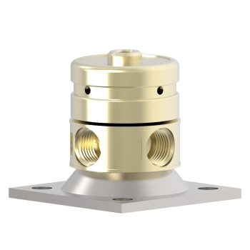 125 Series 1/8 pipe "Interface" valves are ultra-low pilot pressure bleed valves. Pilot signaling pressures as low as 0.1 PSIG effectively blocks the bleed orifice and the internal, full pressure completes the shift to the actuated position. Primary valve is classic Humphrey diaphragm poppet principle. Ideal for fluidics, proximity switching and air jet sensing.