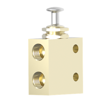 Three way miniature push-pull button valve, detented, with 1/8 pipe ports. All TAC pushbutton valves feature an attractive, work hardened SST button above a 15/32-32 threaded collar. Feature permits panel mounting and bottoms out on collar to prevent valve overstroke. Compact. Rugged.