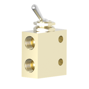 Three way miniature toggle valve, detented, with 1/8 pipe ports. TAC toggle valves feature an attractive lever above a 15/32-32 threaded collar. Feature permits easy panel mounting. Toggle design prevents valve overstroke. Compact. Rugged.